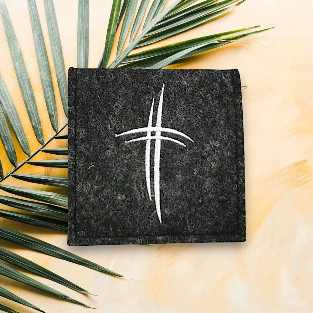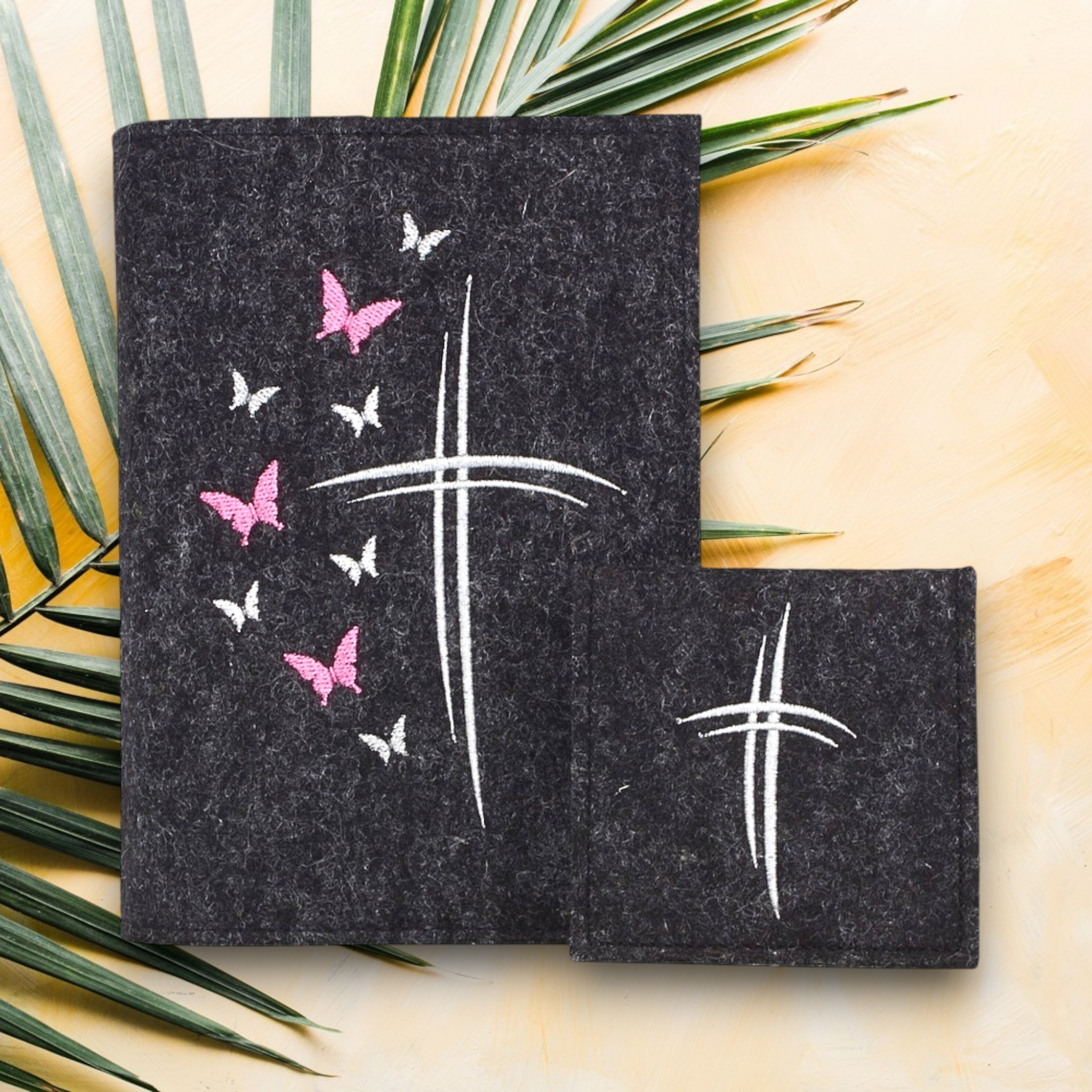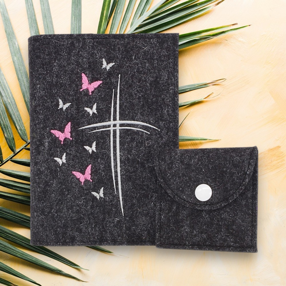 Preview: Wosadnikhülle/Gotteslobhülle in Anthrazit meliert, Kreuz, Schmetterlinge