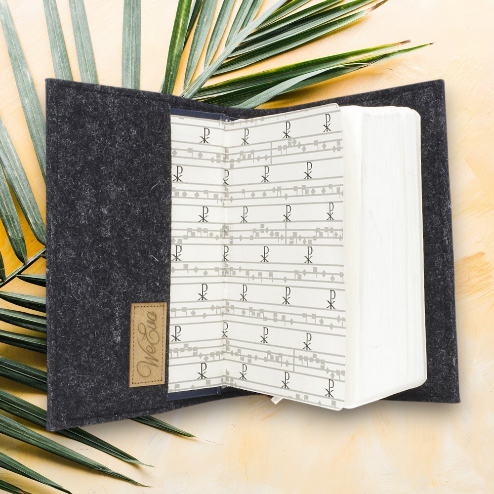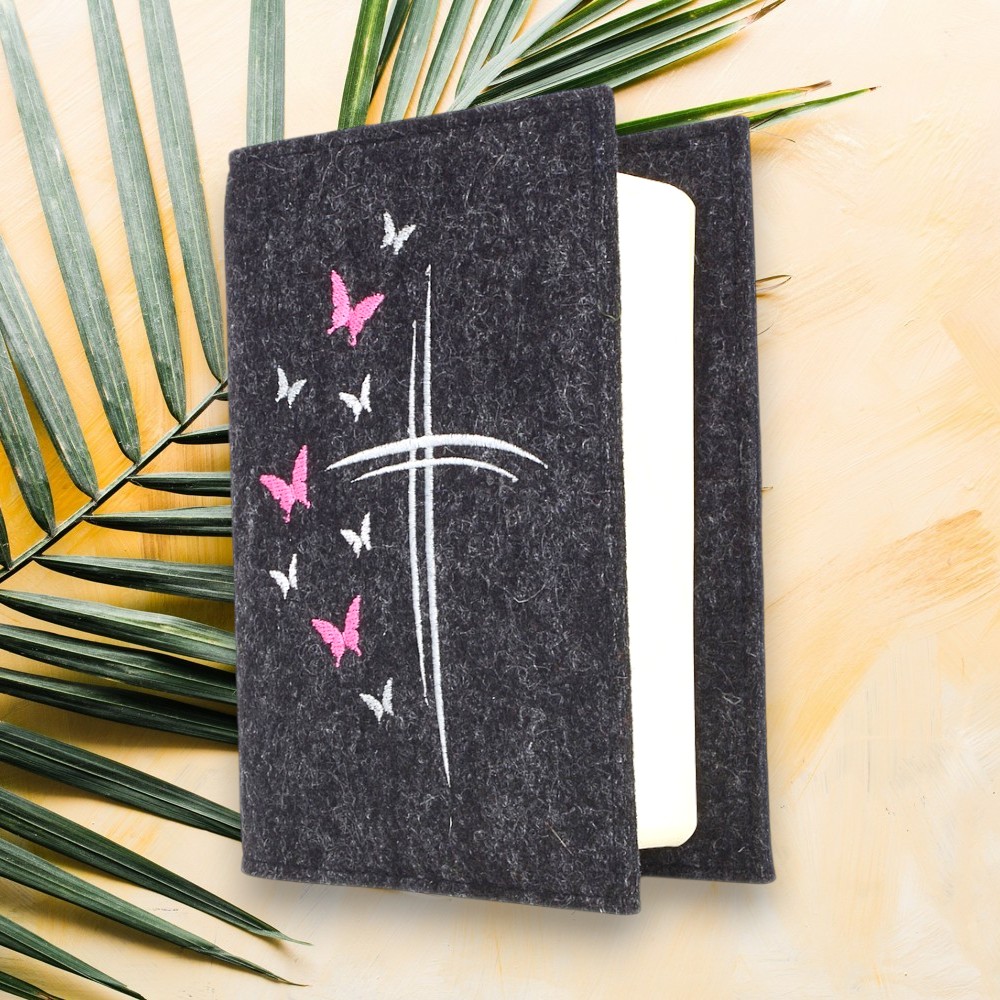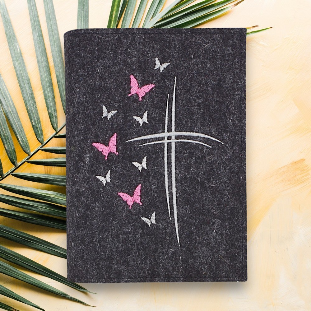 Wosadnikhülle/Gotteslobhülle in Anthrazit meliert, Kreuz, Schmetterlinge
