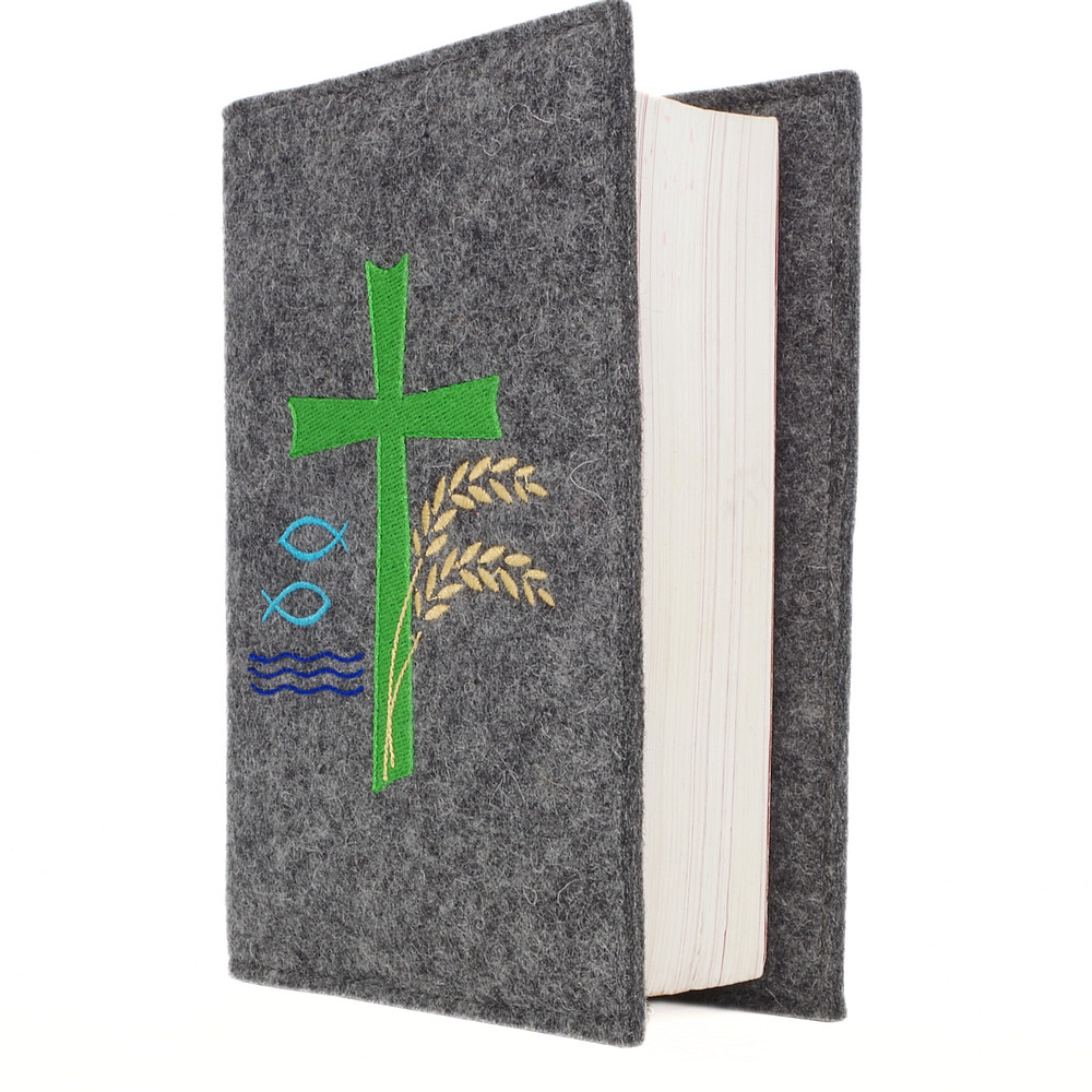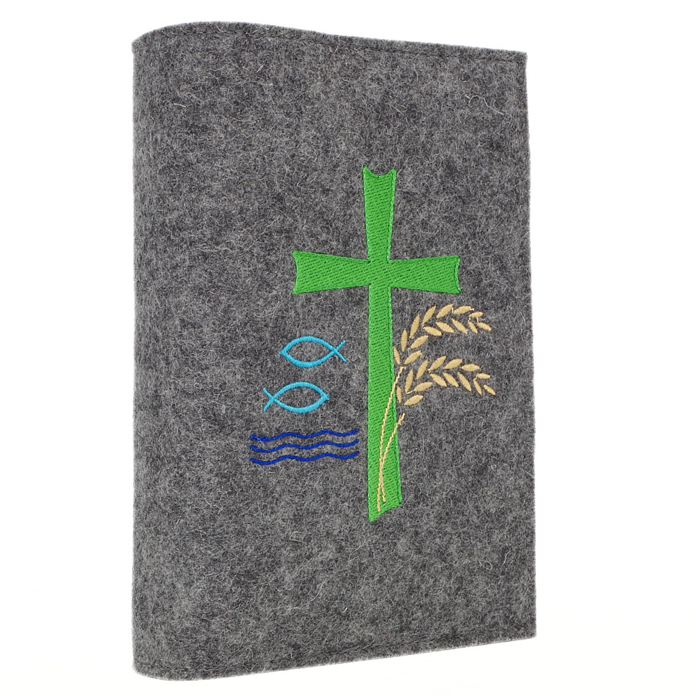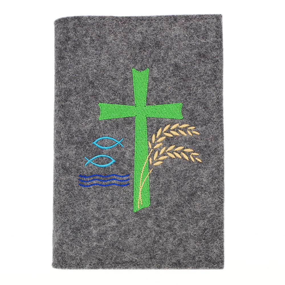 Wosadnikhülle, Gotteslobhülle in Dunkelgrau meliert, Kreuze, Fische, Weizen