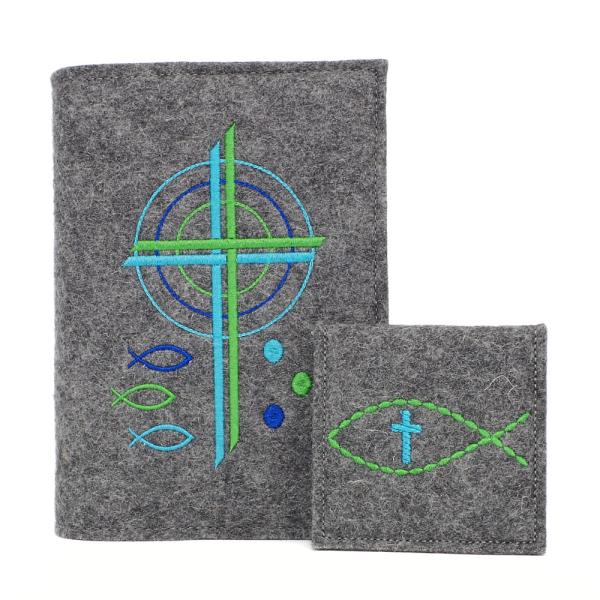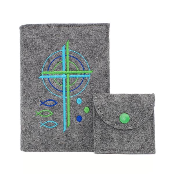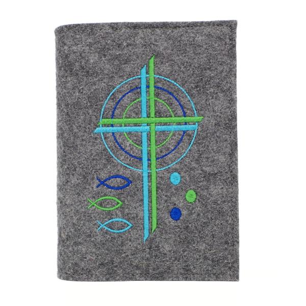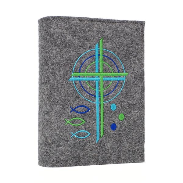 Wosadnikhülle, Gotteslobhülle in Dunkelgrau meliert, Kreuze, Kreise, Fische